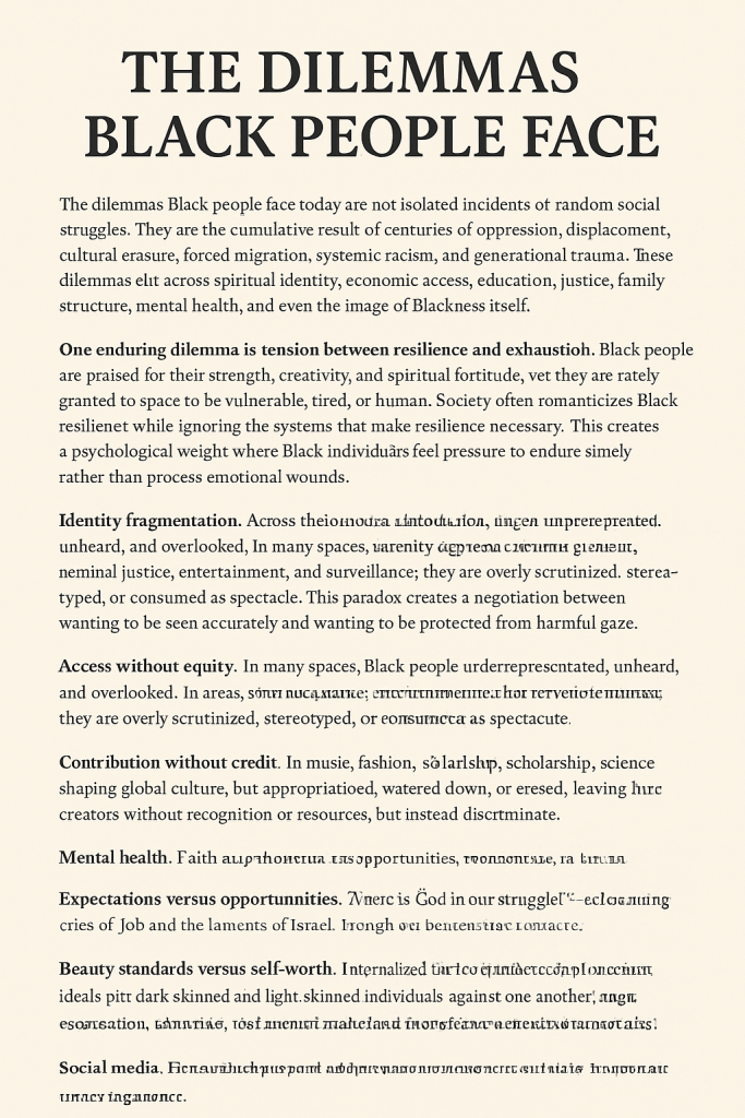 And at the heart of all dilemmas lies a deeper spiritual one: the ongoing struggle for self-definition. Black people are constantly reclaiming a narrative that the world has tried to rewrite. This dilemma fuels movements, art, scholarship, and faith-based awakenings that reconnect Black people to origin, dignity, and divine purpose.